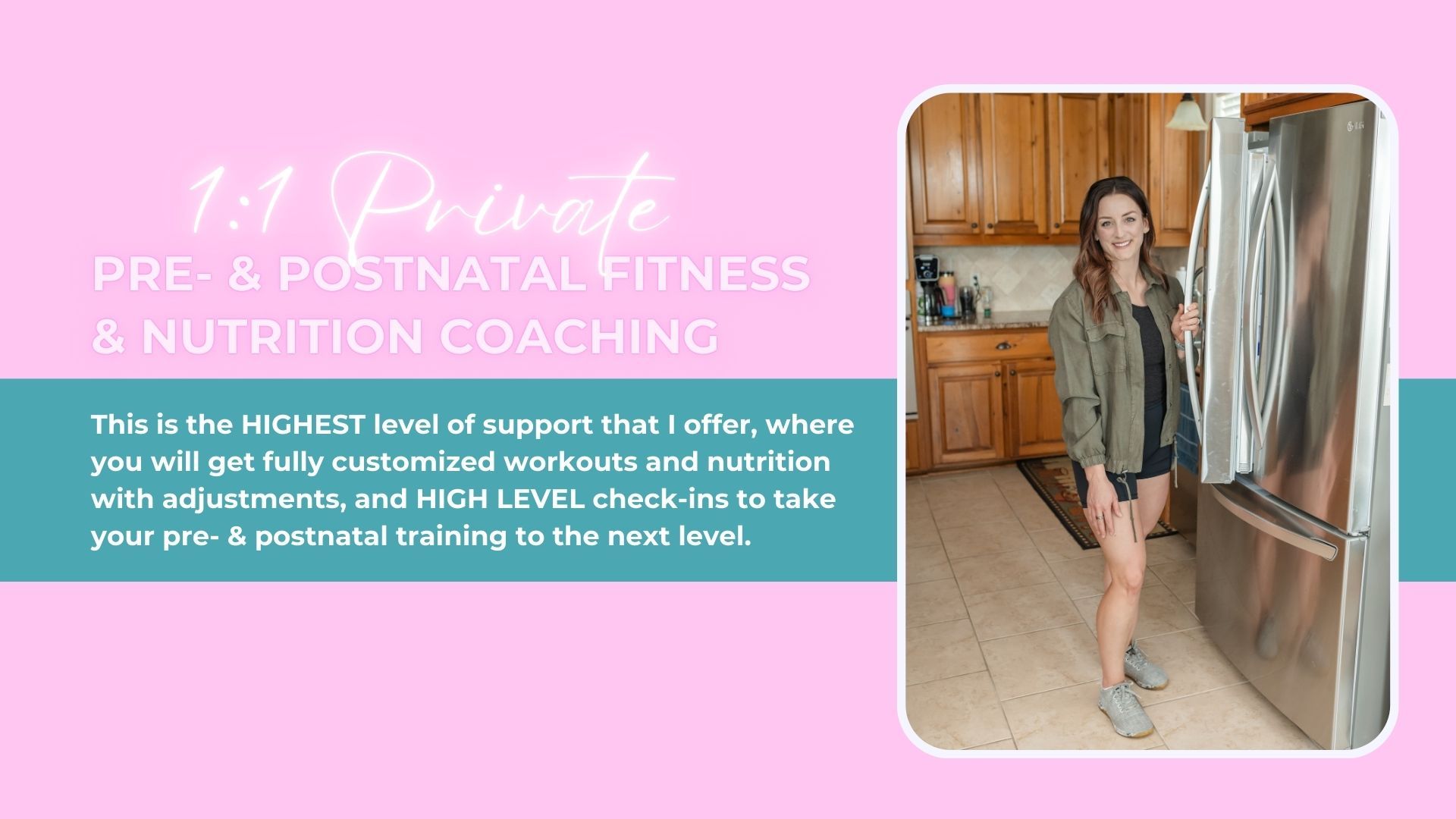 This is the HIGHEST level of support that I offer, where you will get fully customized workouts and nutrition with adjustments, and HIGH-LEVEL check-ins to take your pre- & postnatal training to the next level.