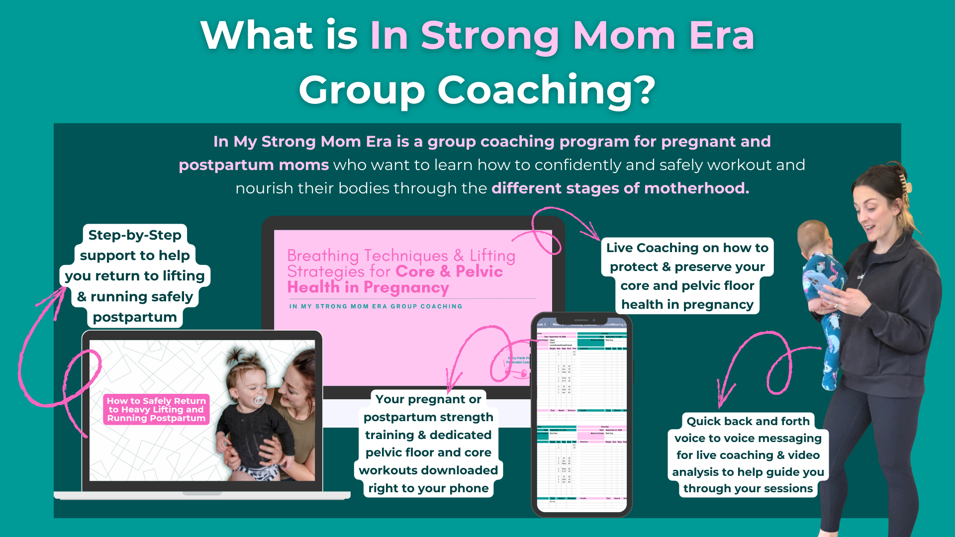 - LIVE GROUP COACHING CALLS: Every month I run a live training on topics that you need + common struggles that come up in the group like “Breathing Techniques and Lifting Strategies for Core & Pelvic Floor Health in Pregnancy and Postpartum